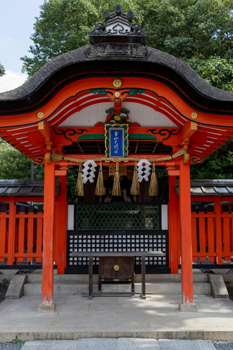 Templo en Heiankyo (Kyoto), luego la capital de Japón. Kukai había dicho que se había encontrado con un anciano que llevaba arroz en la montaña Inari y lo consideraba una reunión con el dios mismo. Cuando el emperador cayó gravemente enfermo, fue solo otorgándole a Inari un alto rango de corte que se aseguró su recuperación.