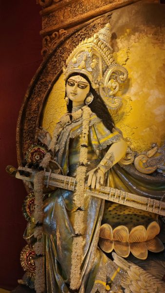 Las escuelas y bibliotecas son sus templos; Libros, bolígrafos, todas las herramientas del artista e instrumentos musicales son los elementos utilizados en puja para la diosa iluminadora de la sabiduría.