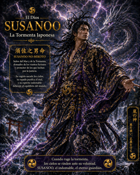 Take-haya-Susa-no-wo o Susanoo es el dios de la tormenta de la religión sintoísta. Hermano menor de la diosa del sol Amaterasu, es famoso por su comportamiento travieso y, a veces, destructivo y, por lo tanto, tiene la reputación de ser una especie de embustero. También está asociado con el viento y el mar, y en tiempos más recientes se ha asociado con el amor y el matrimonio. Según la mitología japonesa, el dios de la tormenta y el mar Susanoo fue uno de los tres hijos nacidos del dios Izanagi-no-Mikoto y la diosa Izanami-no-Mikoto. Él es el hermano de Amaterasu (diosa del sol y una figura sumamente importante en la antigua religión sintoísta) y Tsukiyomi (el dios de la luna notoriamente malhumorado).